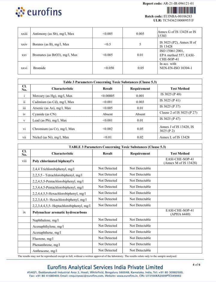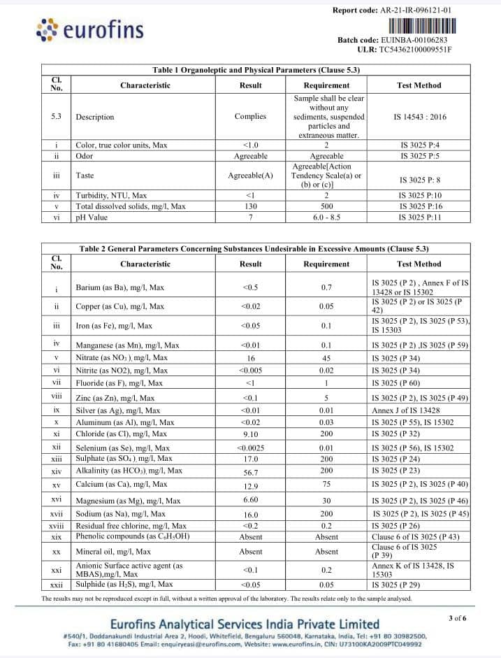 A travers les résultats de ce laboratoire européen de standing international, vous allez constater que notre eau n’a aucun impact négatif sur la santé de nos clients pour la consommation en grande quantité et à long terme. Nous produisons notre eau avec des normes mondialement reconnues et recommandées par l’OMS.